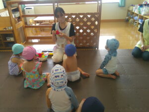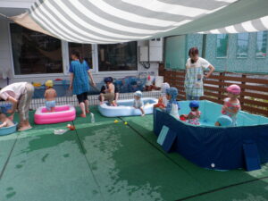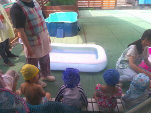いよいよひだまり保育園のプール遊びが始まります!最初の日はプールでのお約束を絵本を使ってみんなでお話ししました。ぱんだぐみの子どもたちは「走ったら危ない」ことが分かったようです!おもちゃの紹介や遊び方の話、体操、消毒をしていよいよ入水!こあらぐみの子どもたちはびっくりして少し泣いてしまいましたが、他のクラスの子どもたちはへっちゃらで楽しそうに遊んでいました♪