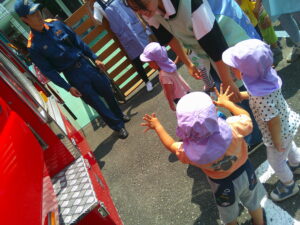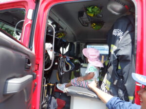 消防車を近くで見たり、助手席に乗せてもらったりして子どもたちは大喜びでした😊