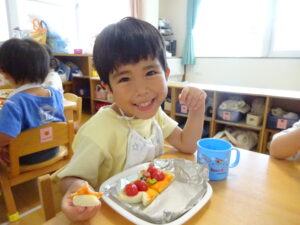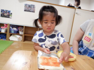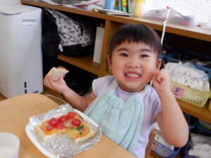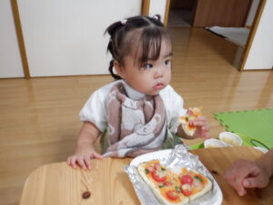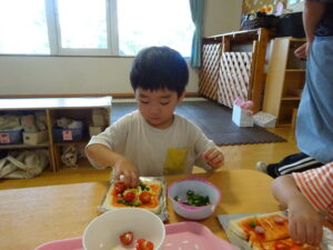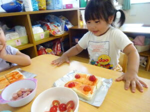 保育園で栽培した、トマトとピーマンを使ってピザトーストを作りました!まず収穫をしてから、クッキング♪パンへ好きな具材を盛りつけます。