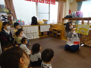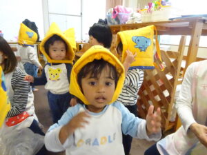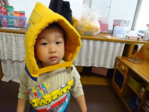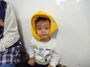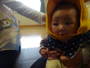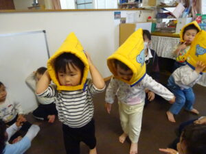 今年度初めての避難訓練を行いました。「地震ってなに?」を紙芝居を使ってお話ししました。頭や身体を守るために、机の下にもぐること、布団やまくら、防災頭巾をかぶることを伝え、実践!最初は布団をかぶることを嫌がる子もいましたが、保育者が一緒に入ると安心してかぶることができました!