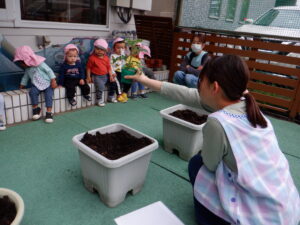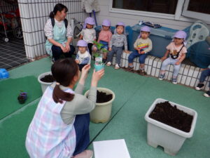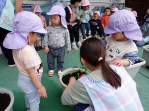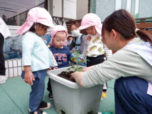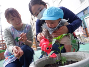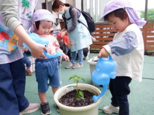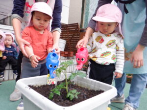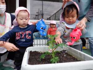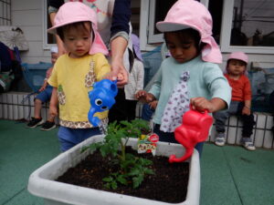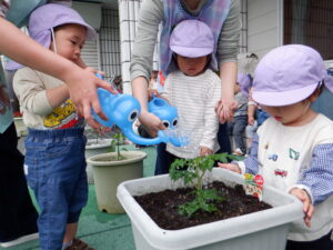 野菜の苗植えをしました!今年もトマト、ピーマン、枝豆を育てます。土のお布団をかけてあげたり、お水のご飯をあげました。子どもたちは「もう一回やりたい!」と水やりが楽しかったようです。毎日水やりをしながら、野菜たちの成長や変化をみんなで一緒に楽しんでいきたいと思います(*^^*)