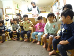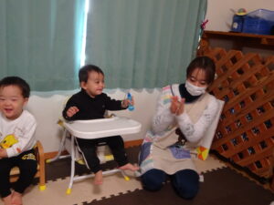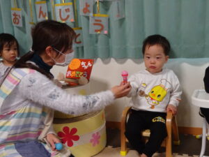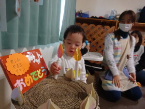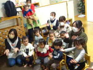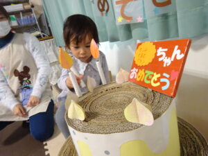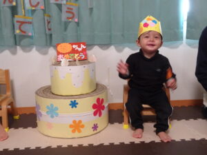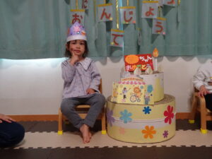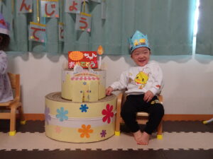 12月生まれは、ぱんだぐみのカンムちゃん、うさぎぐみのやまとくん、こあらぐみのアランくんです!カンムちゃんとやまとくんは少し緊張気味でしたが、質問に答えたり、ろうそくをさしたりして主役の誕生日会を楽しんでいました!アランくんはたくさんのお友だちや先生と目が合う度にニコニコ😊ずっとご機嫌でした♪